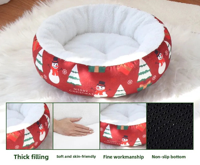 This round pet bed is designed to provide a warm, cozy, and secure resting space for pets during colder seasons. Featuring a thickened structure, it offers excellent insulation to help retain warmth in winter. The soft cloth material creates a comfortable surface for daily lounging and restful sleep. Finished in festive Christmas-inspired colors, this round bed adds seasonal charm while keeping pets comfortable and relaxed.