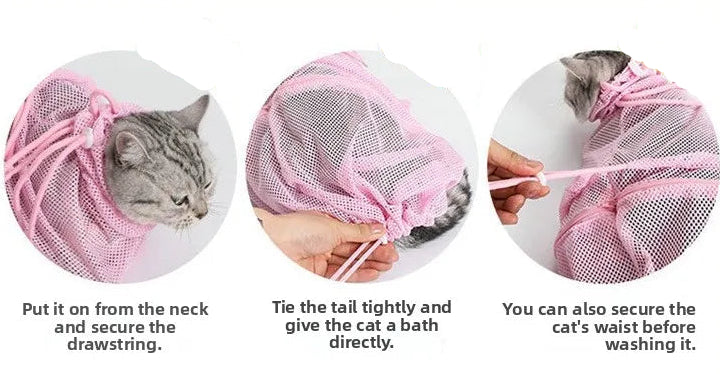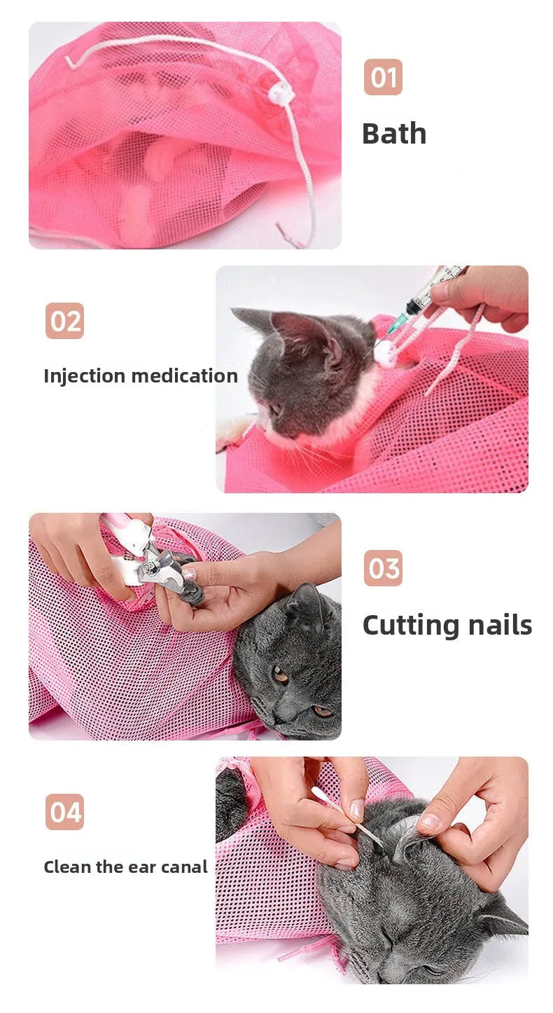 This scratch-prevention cat bathing bag is designed to provide safe, secure restraint during grooming and care routines. Constructed from breathable mesh fabric, it ensures proper ventilation and comfort while minimizing stress for your cat. The adjustable straps allow for a customized, secure fit that prevents escape and reduces the risk of scratches or bites. Lightweight and portable, the bag is suitable for a variety of uses including bathing, nail trimming, ear cleaning, and administering medication, making it a practical grooming solution for both home and travel use.