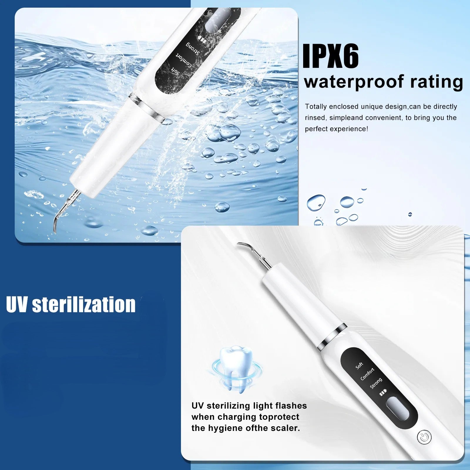 This ultrasonic pet dental kit is designed to provide safe, effective, and hygienic oral care for dogs at home. Using advanced ultrasonic cleaning technology, it helps remove plaque and tartar while remaining gentle on teeth and gums. Intelligent identification ensures the device automatically pauses when it touches the gums and resumes when in contact with teeth, reducing the risk of irritation. Featuring three adjustable modes—Soft, Comfort, and Strong—it allows pet owners to customize the cleaning intensity based on their pet’s needs. With an IPX6 waterproof rating, UV sterilization for cleaner attachments, and a compact, portable design, this kit offers a convenient and reliable solution for maintaining your pet’s dental health.